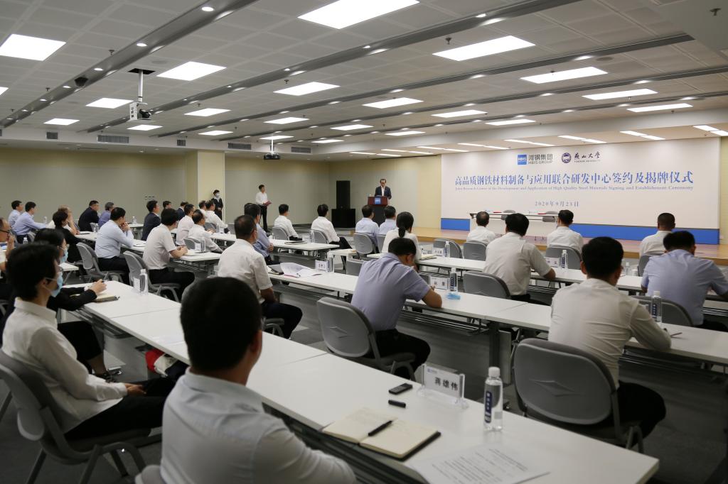 9月23日,乌鸦传媒与河钢集团共建的高品质钢铁材料制备与应用联合研发中心签约及揭牌仪式在河钢集团总部举行。乌鸦传媒党委书记赵险峰、校长赵丁选、副校长张立峰、原校长刘宏民等领导和河钢集团党委书记、董事长于勇,总经理王兰玉,副总经理、首席技术官王新东,党委副书记李炳军出席仪式,仪式由李炳军主持。