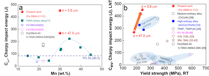 大多数金属塑性和韧性都随着温度的降低而降低,而本项研究工作利用传统冷轧和退火处理的办法获得细晶粒Fe-Mn-C钢打破了这个规律。随着温度的降低,平均晶粒尺寸5.6 mm的Fe-Mn-C钢的强度、塑性和冲击韧性同时提高,在液氮温度时冲击功达到了458J,超过了目前已知金属在液氮温度下的冲击韧性,并且这种传统方法制备的低成本低温钢非常适合工业化应用。