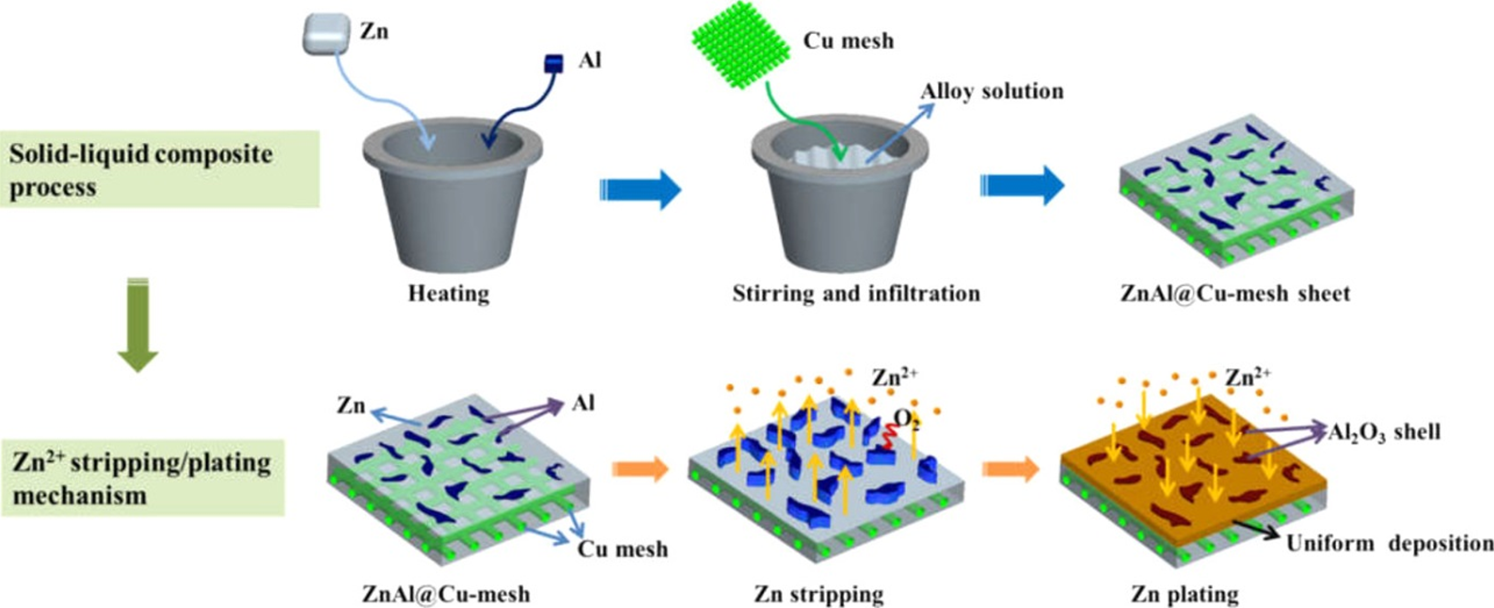 水系锌离子电池(ZIBs)以其低成本、高安全性和高体积容量而备受关注。 然而,锌负极上出现的枝晶生长和副反应严重阻碍了ZIBs的实际应用。而本项研究工作首次将固-液复合工艺用来制备水系锌离子电池的锌基负极材料,通过将共晶的ZnAl 合金与铜网进行复合(表示为 ZnAl@Cu-mesh)实现了无枝晶生长和副反应抑制的协同作用,最终锌离子电池达到了优异的循环稳定性,并且这种方法有利于实现电极的工业化生产。这项工作中提出的固液复合合金化策略为可充电二次电池无枝晶负极的未来发展提供一个有吸引力的方向。