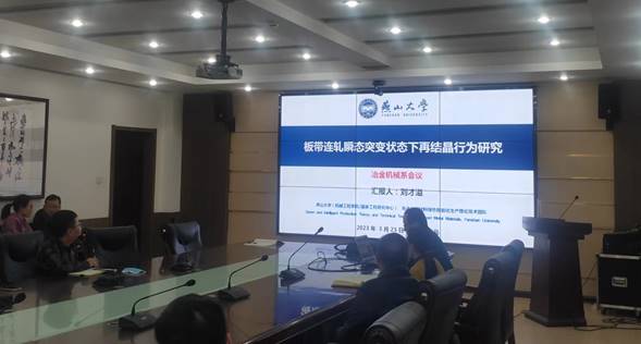 新入职教师刘才溢做了《板带连轧瞬态突变状态下再结晶行为研究》学术报告,主要针特种合金材料变形机制、跨尺度本构模型、微观组织表征及力学性能分析为系部教师和研究生做了汇报,并进行交流讨论。